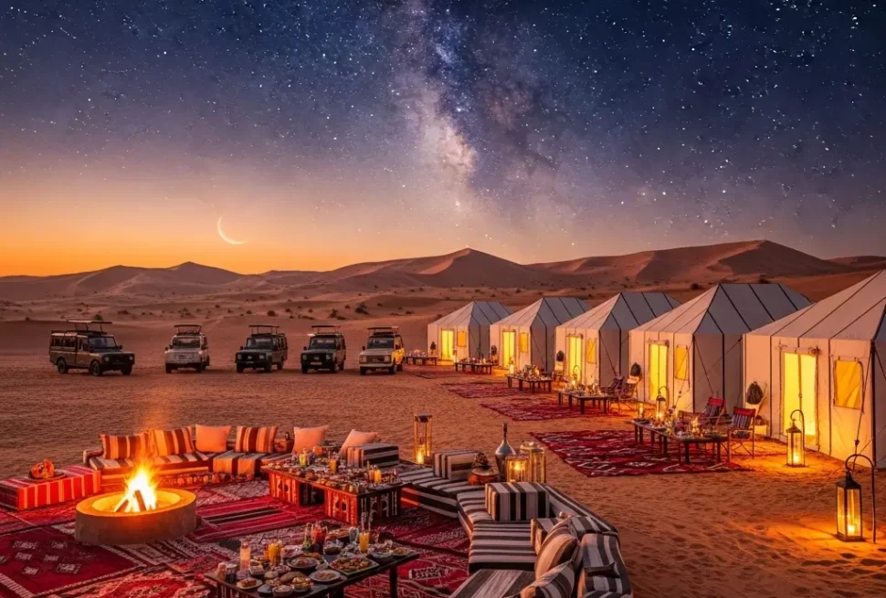 For travelers seeking the ultimate Dubai Safari Comfort, the overnight stay is the premier choice. In the past, this meant a sleeping bag on the sand. In 2026, it means “Glamping.” Luxury overnight packages provide elevated tents with full-size beds, high-thread-count linens, and private en-suite bathrooms.
